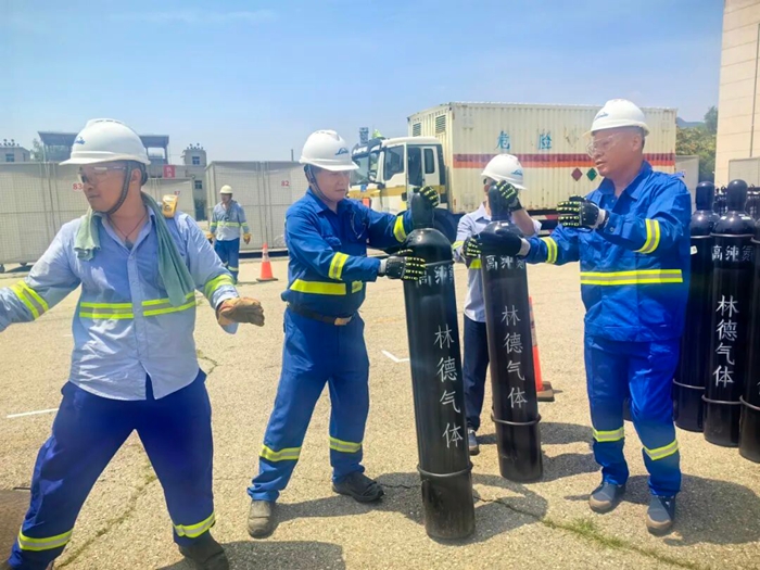 為了在規(guī)定時(shí)間完成相關(guān)任務(wù),北普公司將全部人員分成若干工作小組,組長都是由多次參加重大活動(dòng)保障任務(wù)的老員工擔(dān)任,小組的主要任務(wù)是在規(guī)定時(shí)間內(nèi)將鋼瓶推放并綁定在指定位置,裝表、聯(lián)管、上槍、調(diào)壓,充氣作業(yè),巡視、加壓、換瓶,一個(gè)個(gè)規(guī)范動(dòng)作都責(zé)任到小組到個(gè)人,目標(biāo)只有一個(gè),配合協(xié)作單位在規(guī)定時(shí)間內(nèi)完成罐裝,以最安全的方式、最快的速度將現(xiàn)場(chǎng)高純氦氣鋼瓶撤出,確保特制移動(dòng)籠房能夠準(zhǔn)時(shí)出發(fā)。